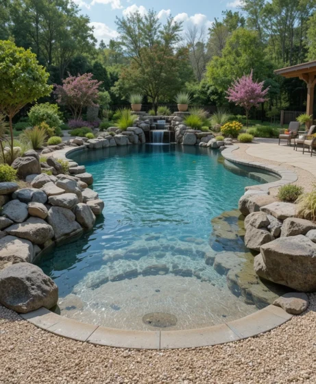 A gradual beach entry replaces traditional steps. The shallow slope makes it easy for kids and older adults to enter safely. Sand-colored gravel enhances the realistic shoreline appearance Natural Pool Ideas.