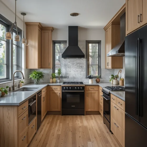 Black accents like handles, lighting, or faucets add bold contrast to oak cabinets. The mix feels modern and confident. It’s ideal for contemporary US kitchens.