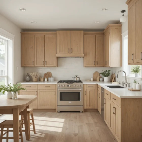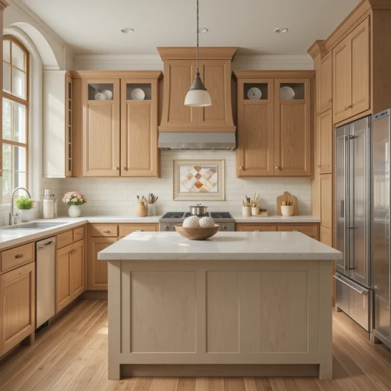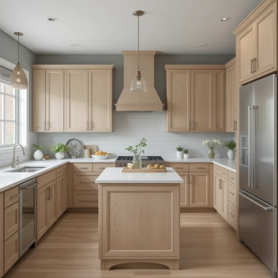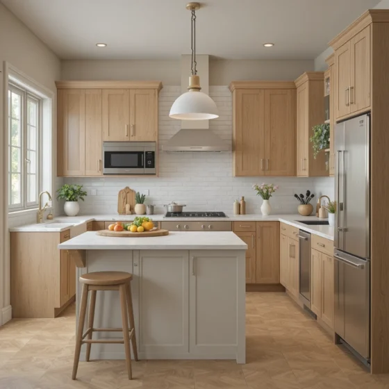 Light oak cabinets paired with warm beige tones create a cozy yet modern look. This scheme feels calm and balanced without looking flat. It works beautifully in both small and large kitchens.