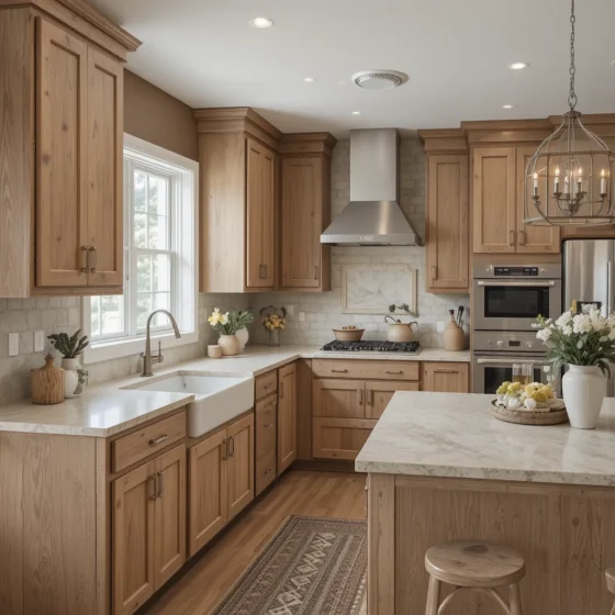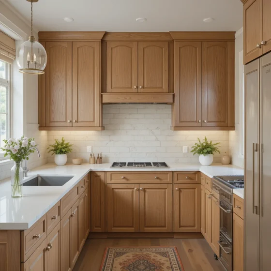 Honey oak adds warmth, while white countertops provide contrast and freshness. This combination feels cheerful and welcoming. It’s perfect for family kitchens that need brightness and durability Oak Kitchen Cabinet Color.