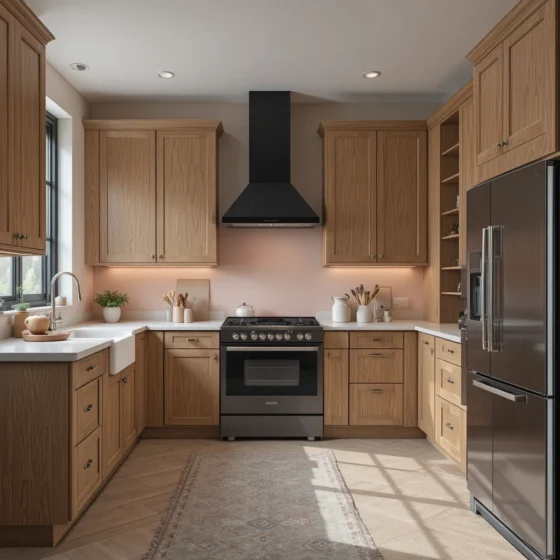 Muted terracotta walls bring warmth and personality. They highlight oak’s natural grain and depth. This look feels grounded and trend-forward for 2026 Oak Kitchen Cabinet Color.