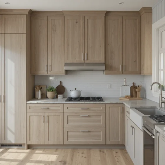 Greige combines gray and beige, offering the best of both worlds. It enhances oak’s warmth while keeping the space neutral. This color scheme is versatile and long-lasting Oak Kitchen Cabinet Color.