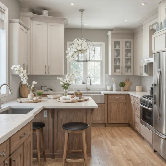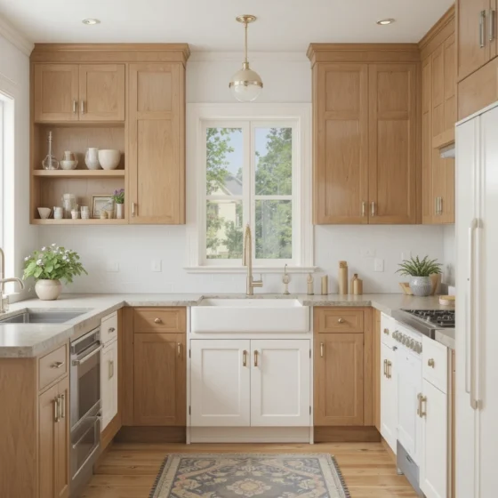 Using oak on lower cabinets and a light neutral on uppers adds balance. It keeps the kitchen visually light. This design is popular in 2026 remodels Oak Kitchen Cabinet Color.