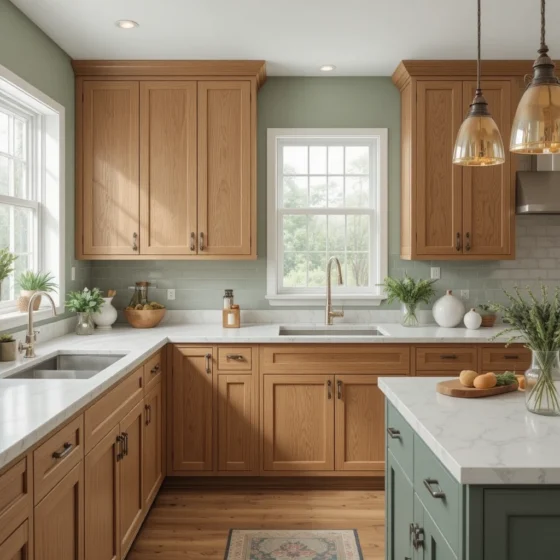 Pale green walls bring a gentle pop of color. They complement light oak cabinets without overpowering them. This look feels fresh and wellness-focused Oak Kitchen Cabinet Color.