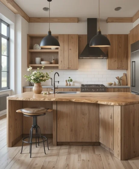 Reclaimed oak countertops add character while reducing environmental impact. Each piece carries unique marks and natural aging that give the kitchen a meaningful story. This design is perfect for homeowners valuing sustainability and authenticity.