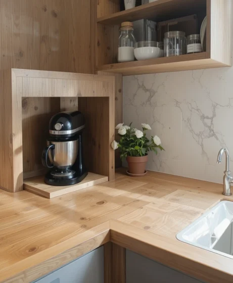 Countertops designed with built-in spaces for mixers, coffee makers, or blenders make the kitchen more efficient. The oak offers warmth while the custom cutouts keep the counters neat. This idea works well in busy kitchens with frequent cooking Oak Kitchen Countertops.