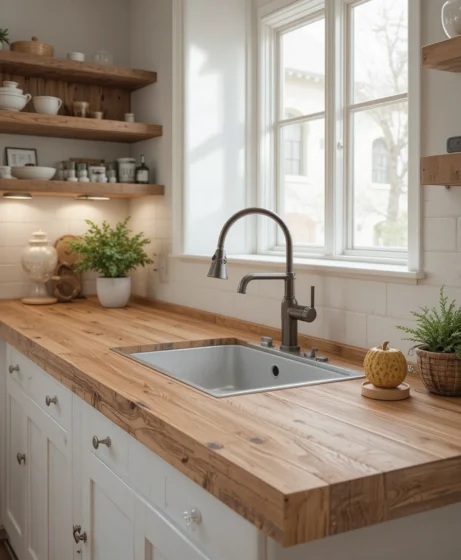 Rustic oak countertops showcase dramatic wood grain patterns, creating a warm farmhouse feel. Their natural texture adds depth and character to the room. These countertops work beautifully with neutral backsplashes and cozy décor styles.