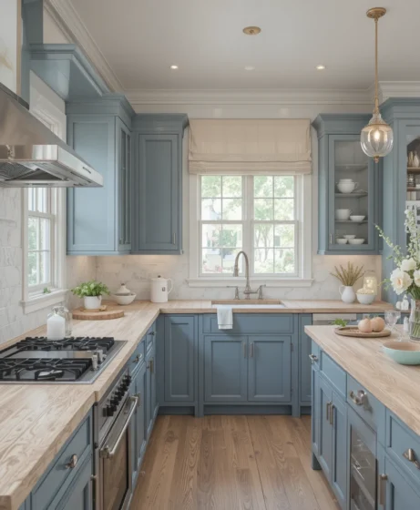 Light oak countertops bring a soft, open feel to the kitchen, making the room look bigger and calmer. Their pale tone reflects natural light beautifully. They pair well with white cabinets and modern appliances for a fresh, welcoming look Oak Kitchen Countertops.