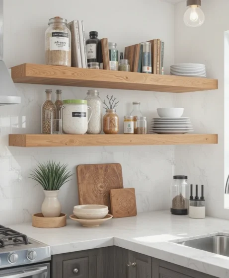 Whether you prefer minimal, rustic, modern, or luxury styles, oak shelves add warmth and character to any kitchen.