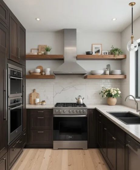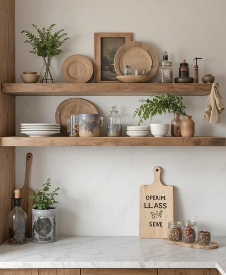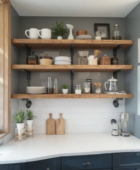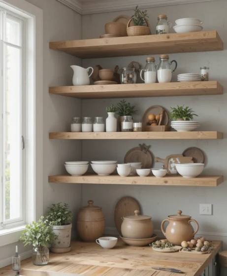 Layering multiple shelves adds height and visual balance to your wall. This arrangement allows for more storage and a well-organized kitchen. It’s a smart way to fill empty vertical space stylishly.