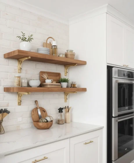 Brass supports add a touch of glamour to oak shelving, creating a warm and upscale look. The mix of gold tones with oak feels timeless. Perfect for homes that want a refined, boutique-style kitchen.