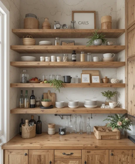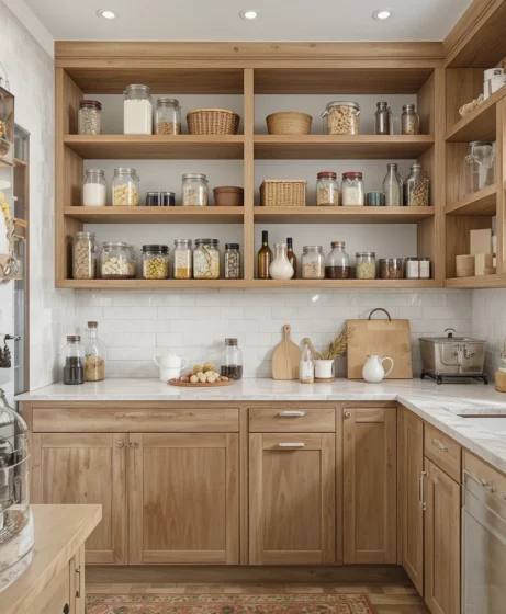 Full-height open oak shelves make pantry items easy to reach while still looking stylish. They showcase jars, baskets, and boxes beautifully. This concept works great for homes that value visual organization.