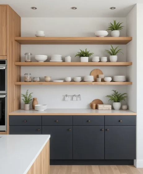 Mixing natural oak with painted wood creates a stylish two-tone effect. This combo adds personality while keeping the design balanced. It works best in kitchens that crave a custom-built feel Oak Kitchen Shelves.