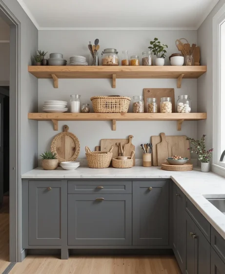 Combining oak shelving with woven baskets improves both charm and functionality. The baskets help organize small items like snacks or utensils. The mixed textures create a cozy, layered feel.