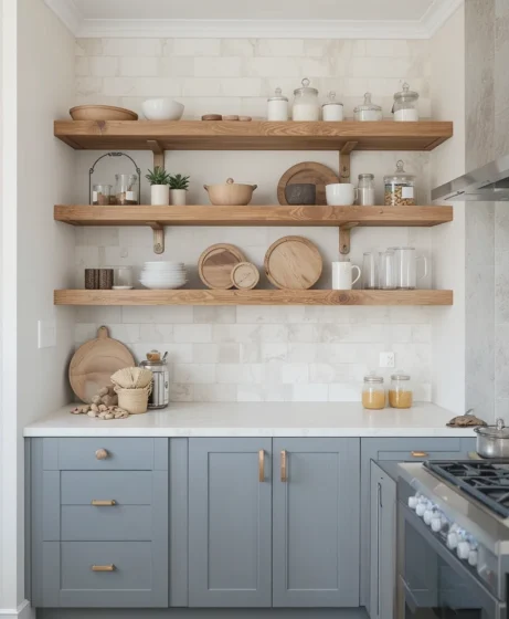 A soft whitewashed finish gives oak a lighter, coastal-inspired feel. These shelves work well in airy kitchens with lots of natural light. They keep the space looking fresh and relaxed throughout the year.