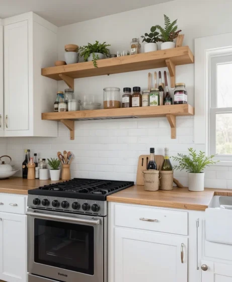 Installing oak shelves above the stove creates a convenient cooking zone. These shelves hold spices, oils, and cooking tools within reach. The natural wood warms up the area beautifully.