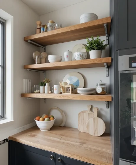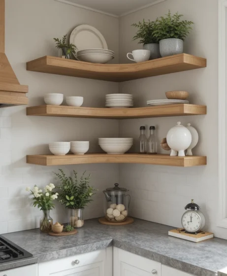 Curved oak shelves bring gentle lines and smooth edges to unused corners. Their rounded shape feels modern while also boosting storage. A great option for small kitchens that need smart space solutions.