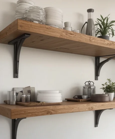 The combination of raw oak wood and bold black brackets adds a farmhouse vibe without overwhelming the space. They provide strong support and give your kitchen a sturdy, stylish look. Perfect for storing dinnerware or rustic décor.