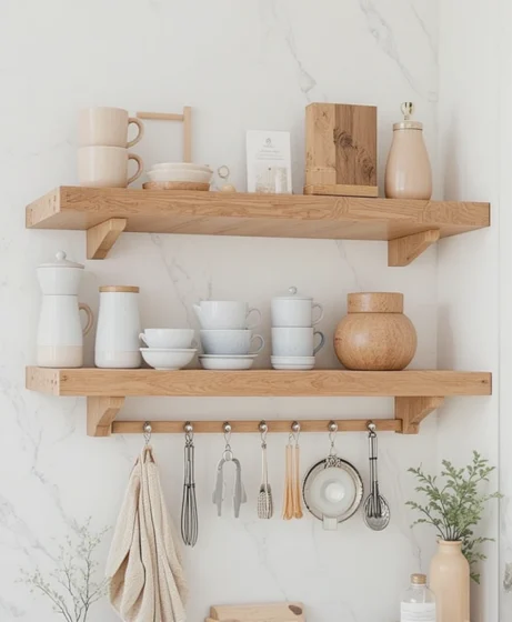 Hooks installed underneath the shelves create space for mugs, towels, or utensils. This makes the shelves extra functional while still looking clean. A smart choice for small kitchens.