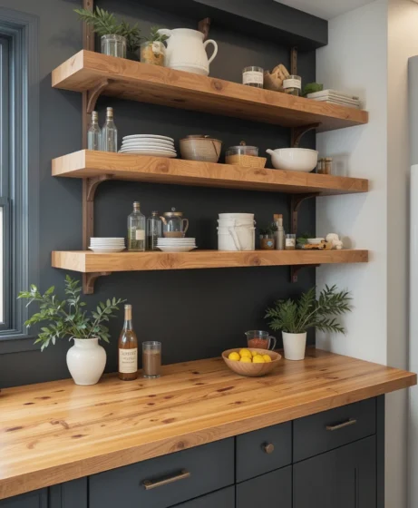 A deep, rich stain gives oak shelves a bold, dramatic look. They pair well with modern appliances and contrasting countertops. Ideal for kitchens wanting depth and a luxurious atmosphere.