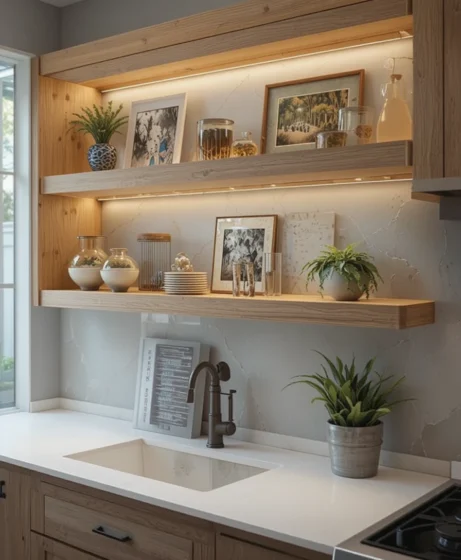LED lights installed under oak shelves create a warm glow that highlights accessories. This setup adds both function and style. It also improves nighttime visibility while cooking or entertaining Oak Kitchen Shelves.