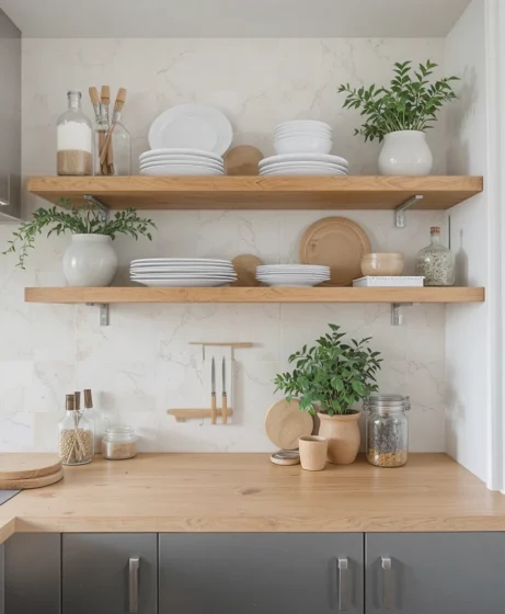 Light-toned oak is perfect for Scandinavian design, known for simplicity and warmth. These shelves add brightness and minimal elegance. Pair with neutral décor to complete the look Oak Kitchen Shelves.