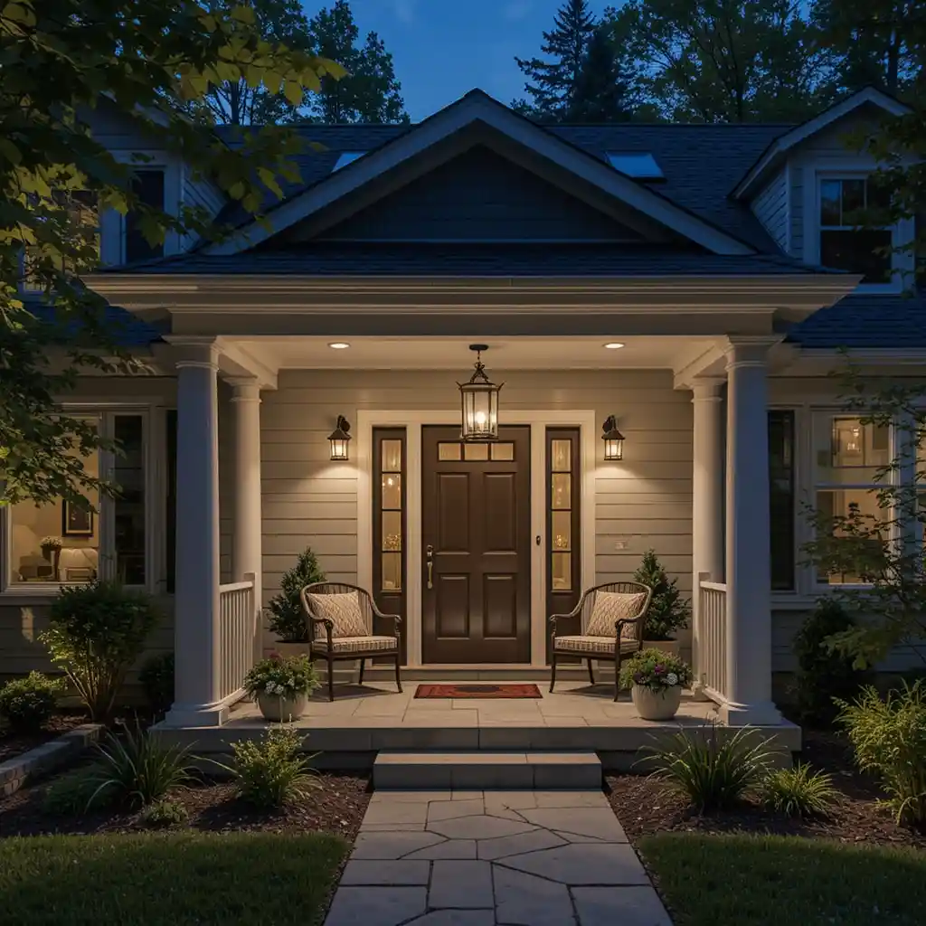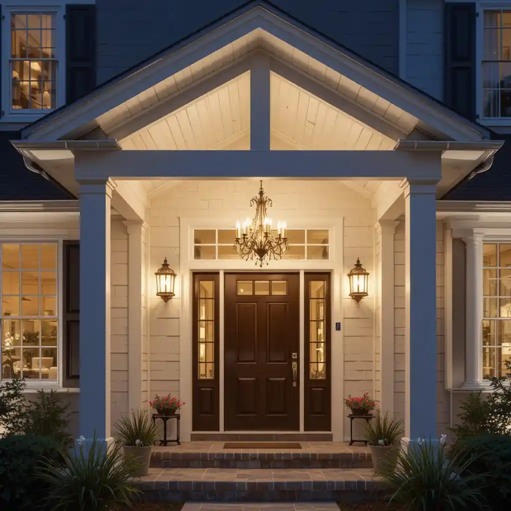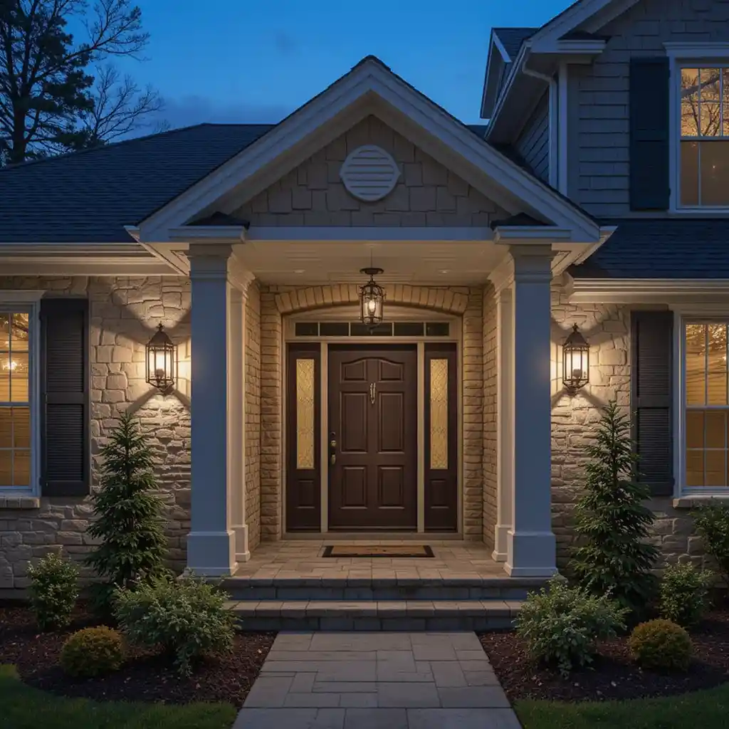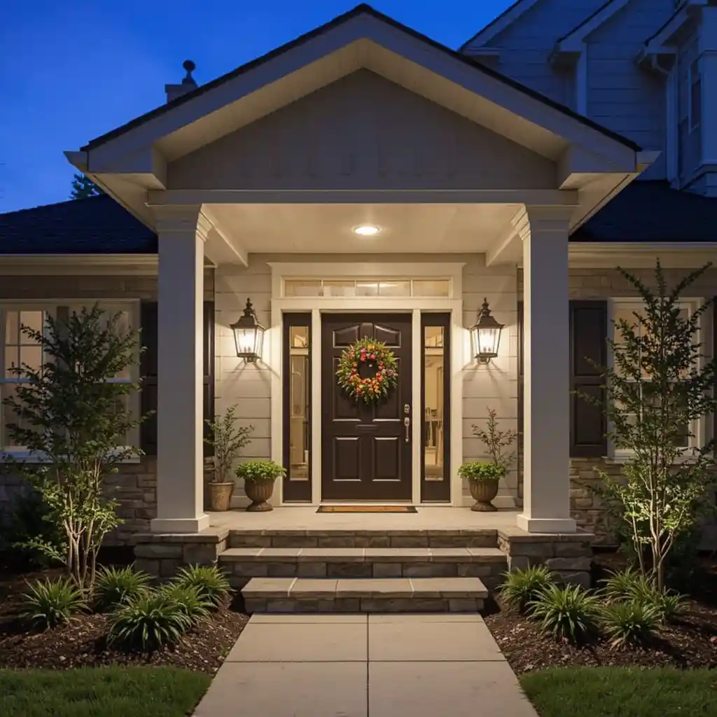 Add traditional lantern fixtures around your entry to bring timeless appeal. Choose warm white bulbs for a welcoming, golden glow.