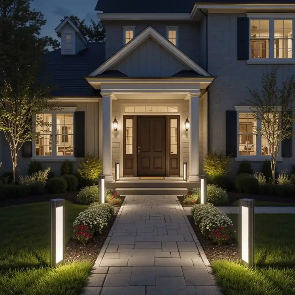 Add short vertical bollard lights to mark the entrance walkway. They’re a sleek alternative to traditional path lights and work well in minimalist designs. Outdoor Lighting Ideas
