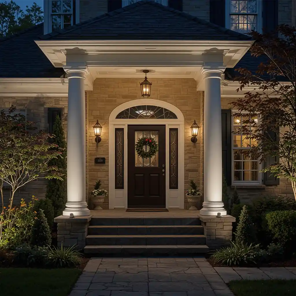 Place uplights at the base of front porch columns to accent architectural details. This technique adds depth and grandeur to your home’s façade.