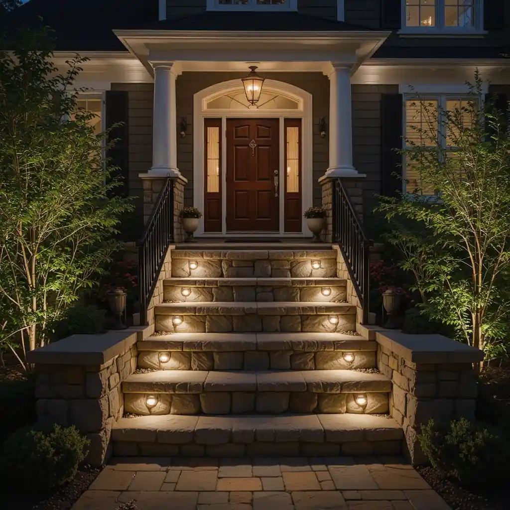 LED step lights make staircases safer while giving your entrance a high-end touch. They’re ideal for both stone and wood steps.