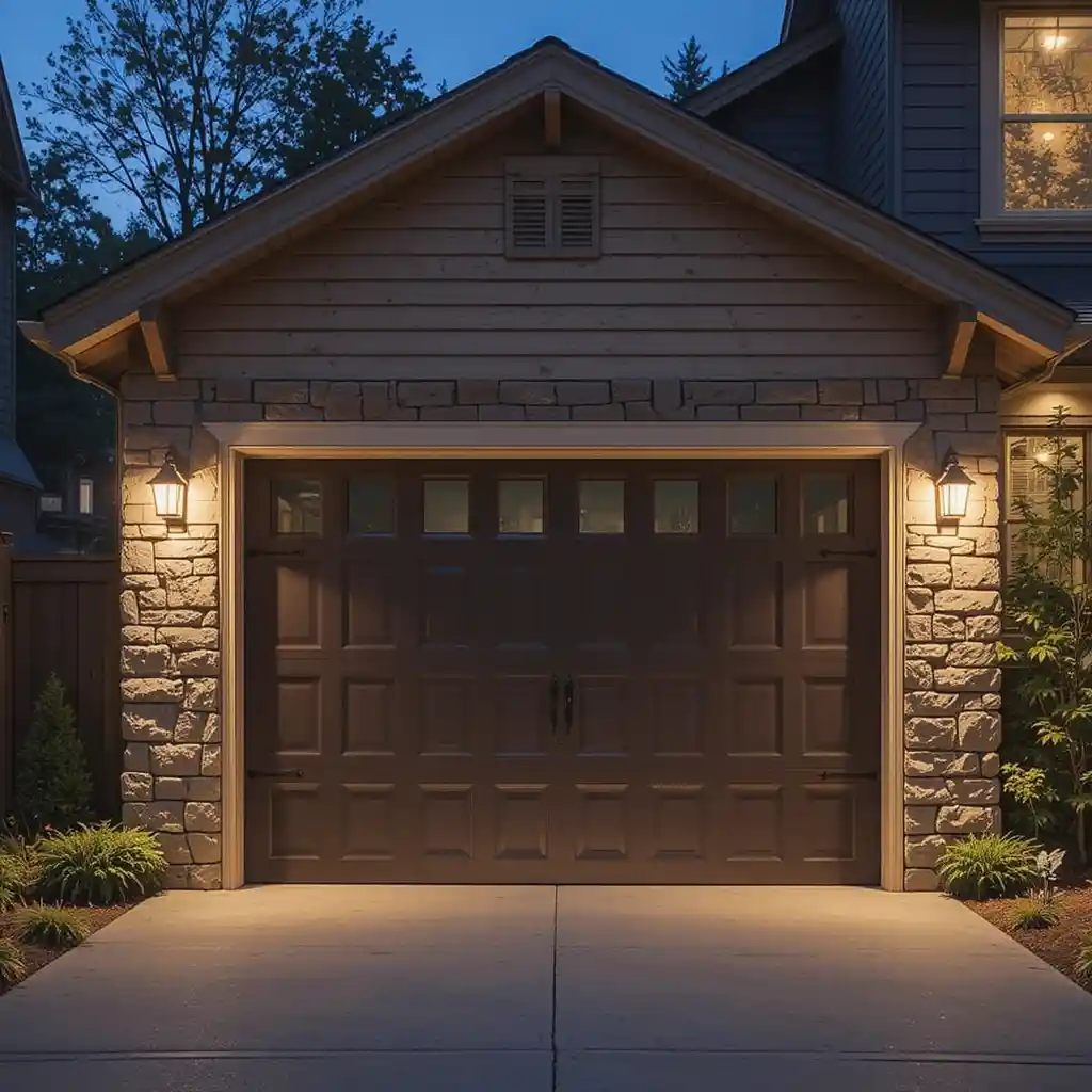Mount garage door lighting on both sides of the opening to draw attention to the structure and provide better visibility at night.