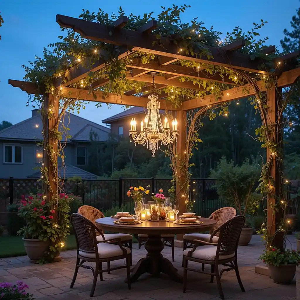 If you have a pergola or tree branch support, hang a weather-safe chandelier to add glamour and focused light. Outdoor Lighting Ideas