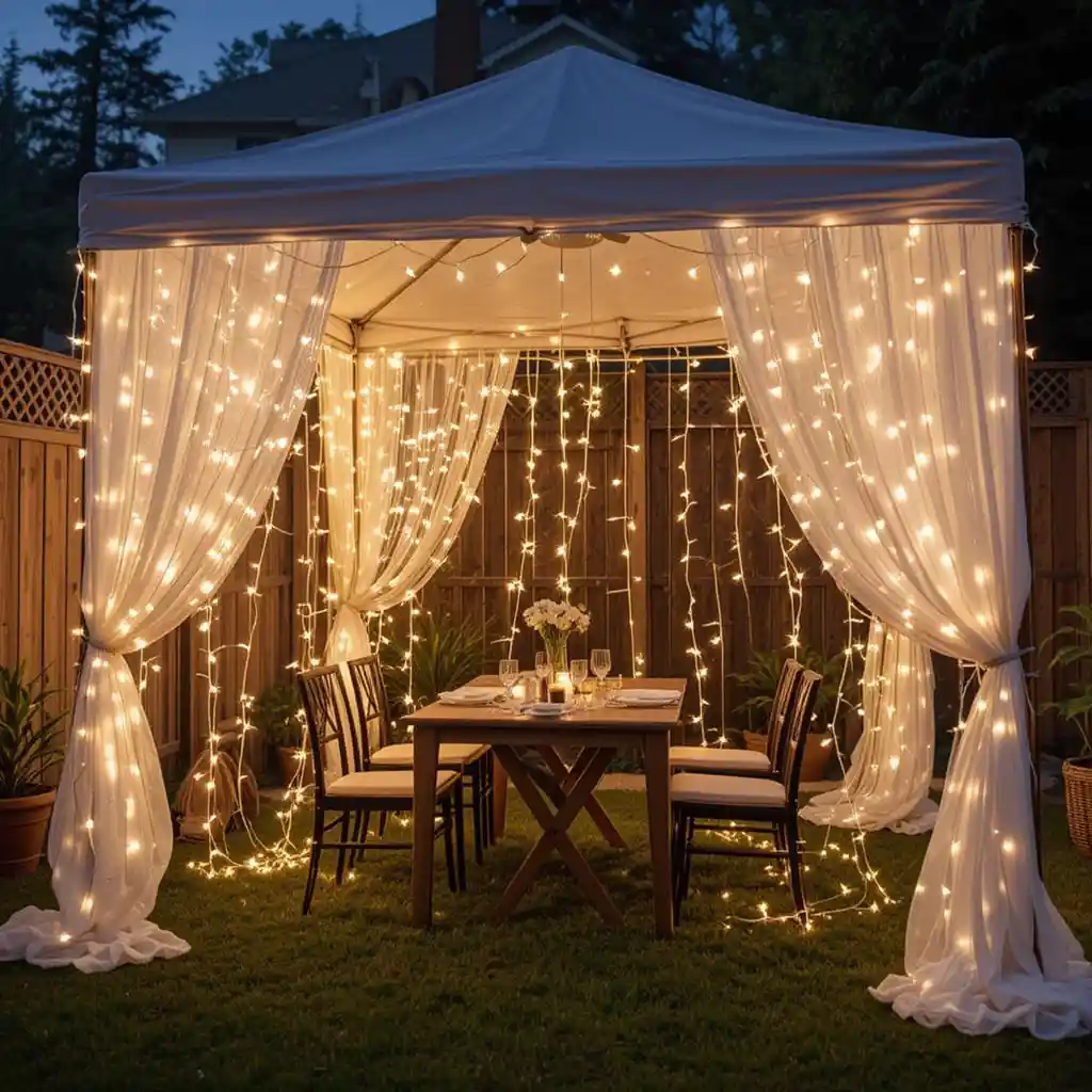 Hang curtain string lights against a wall, fence, or tent to create a glowing backdrop for photos or entertainment areas.
