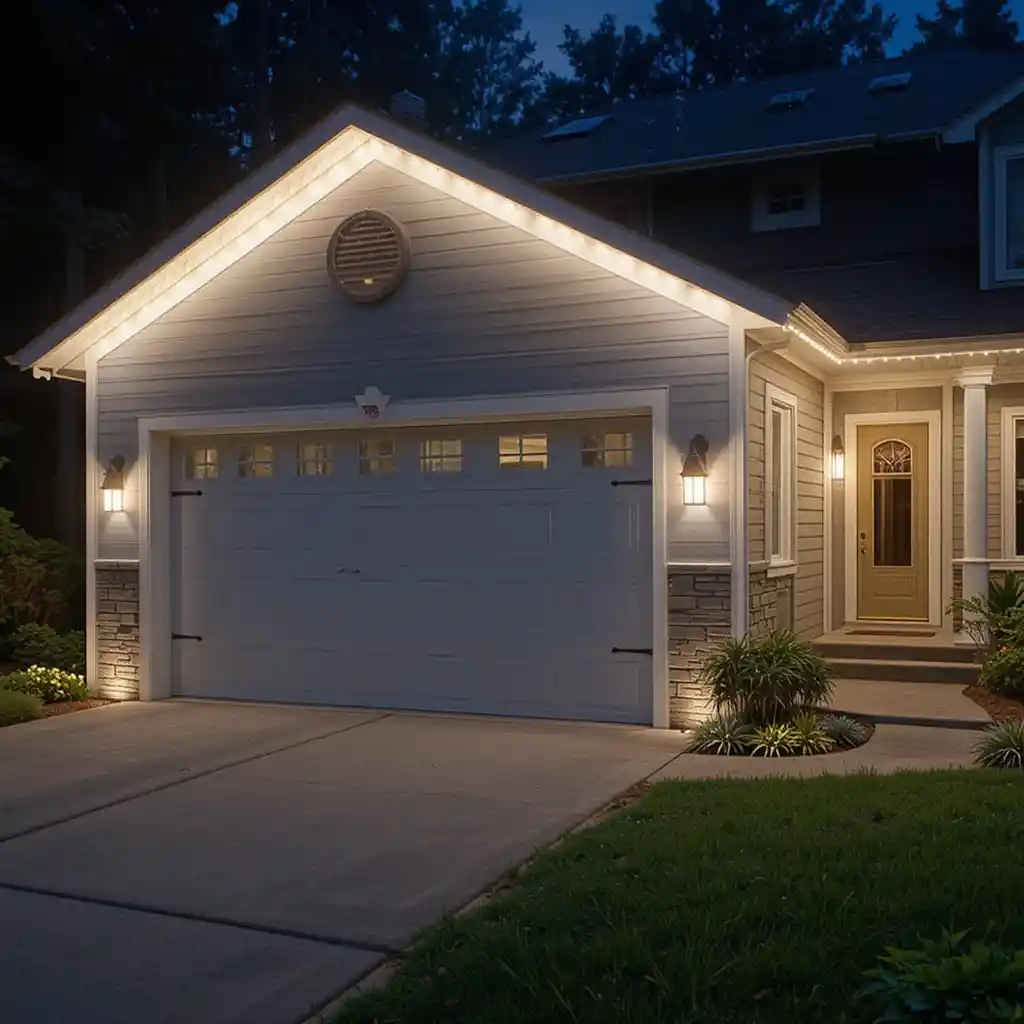 Adding LED strip lights under the garage eaves offers a modern, minimalist look. They provide consistent lighting and accentuate architectural lines without overpowering the space.