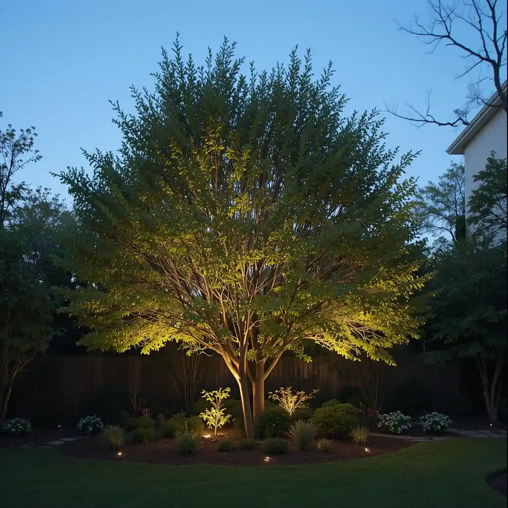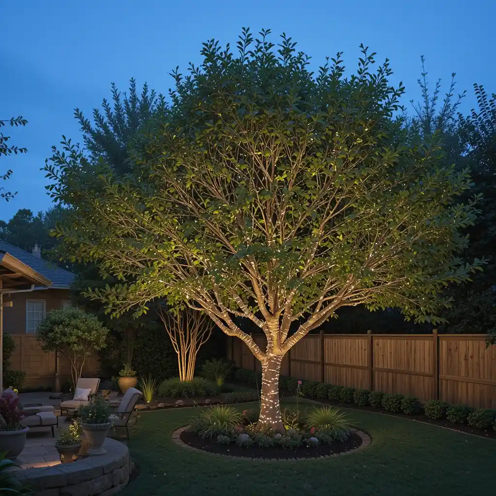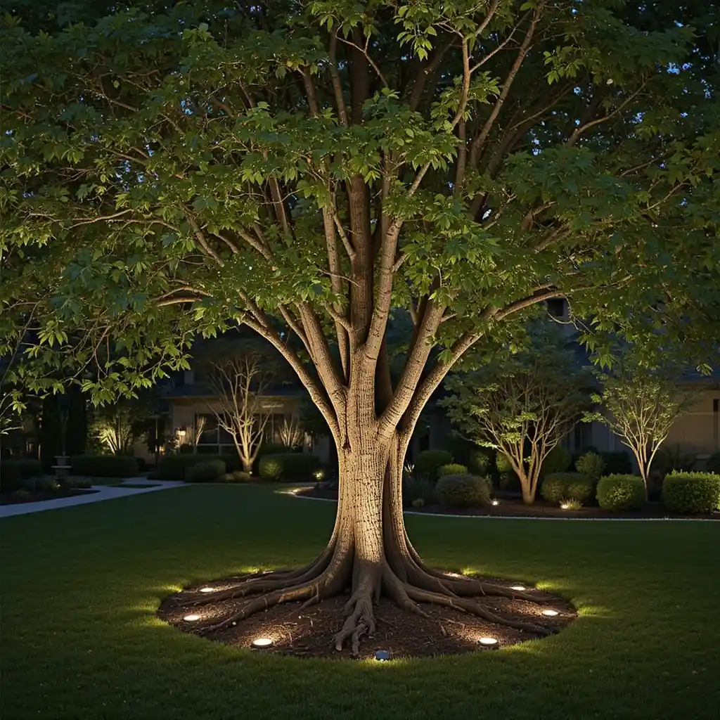 Place solar-powered disc or puck lights around the base to subtly highlight the tree without visible wires or fixtures. Outdoor Lighting Ideas