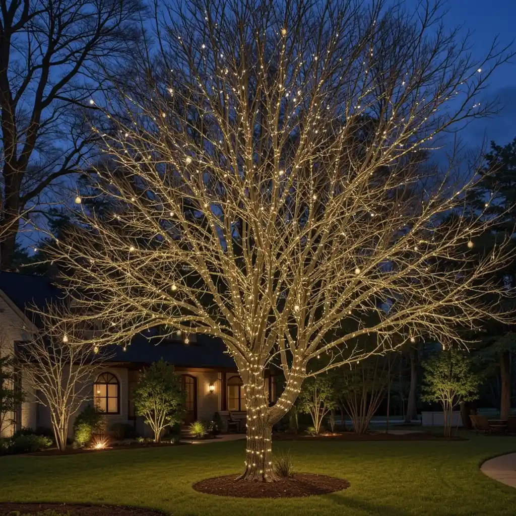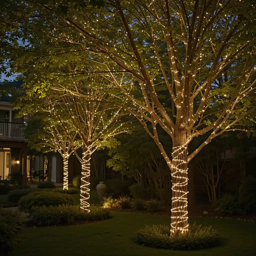 Use mini LED string lights to tightly wrap around tree trunks. It gives off a warm glow and adds a festive feel without being too flashy.