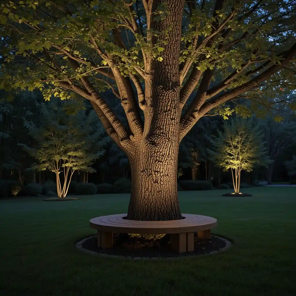 Add under-bench lights around a tree seat. This makes seating usable at night and softly lights the trunk from the base. Outdoor Lighting Ideas