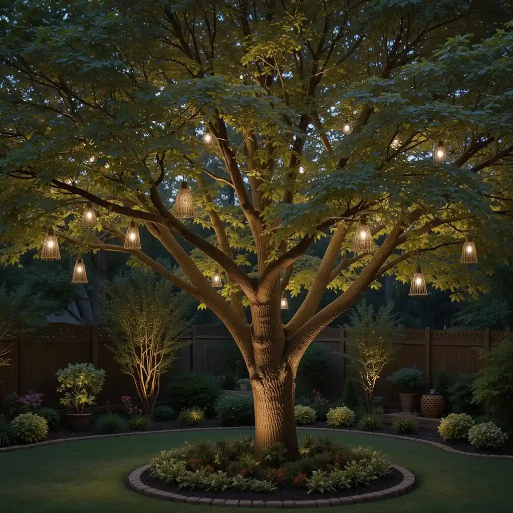 Attach solar or battery-powered lanterns to branches for an ambient glow. Choose paper, rattan, or metal designs to complement your backyard theme.