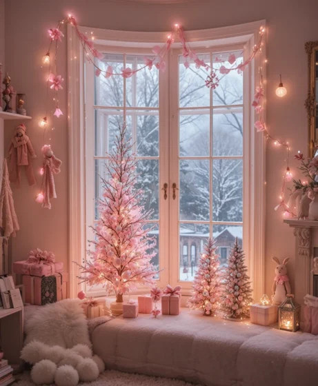 Candy canes and ornaments in pink shades add sweetness and fun. This theme works especially well for kids’ rooms or playful spaces. Pair with white and silver details for balance Pink Christmas Decoration.