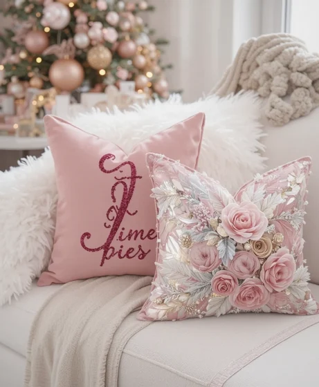 Add pink velvet pillows to living room sofas or bedroom chairs. They make your space feel cozy and coordinated with the overall holiday theme. Pair them with white or metallic pillows for contrast Pink Christmas Decoration.
