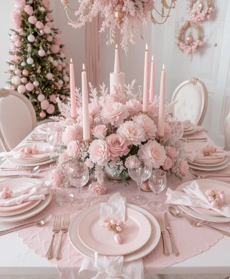 A pink tablescape creates a stunning holiday dining setting. Use blush plates, rose-gold cutlery, and pale-pink linens to complete the look. Fresh flowers in soft tones elevate the entire table.