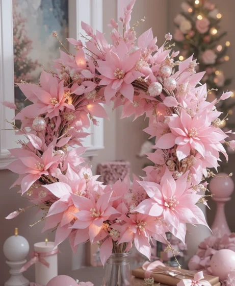 Use pink poinsettias or faux roses to complement your holiday palette. They add texture and soft color without needing water or sunlight. Place them in vases or wreaths for an easy update Pink Christmas Decoration.