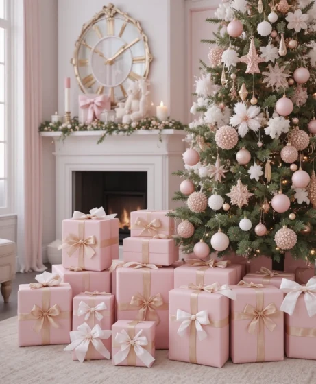 Gift wrap plays a large part in your festive look. Choose soft or metallic pink papers paired with white or gold bows. This creates a unified, stylish holiday theme under the tree.