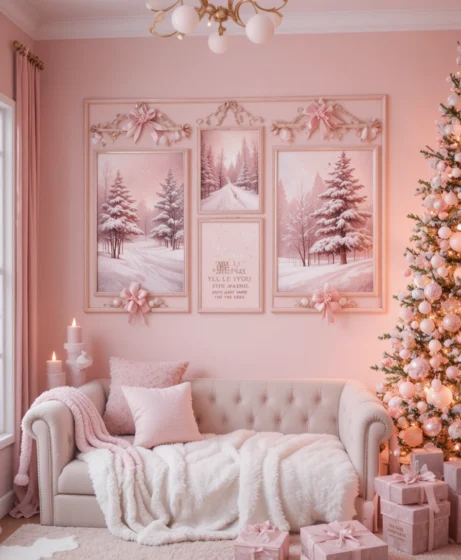 Seasonal wall art featuring pink tones adds bold personality. Choose prints with winter scenes, quotes, or abstract designs. This enhances your theme without overwhelming your space.