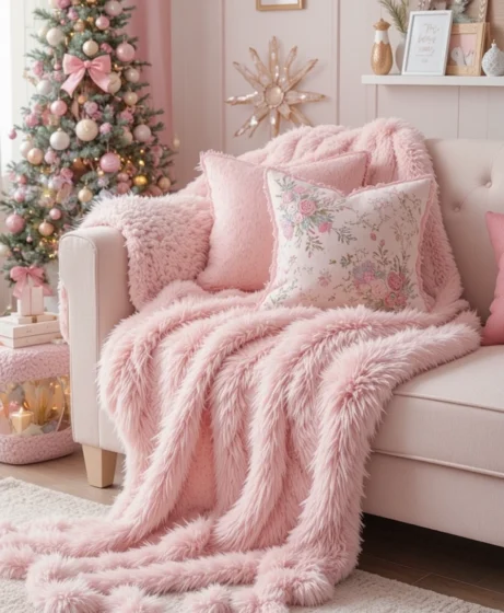 Drape a pink faux fur blanket over your sofa for cozy comfort. It adds warmth during winter and blends easily with holiday décor. This simple piece elevates your pink theme instantly Pink Christmas Decoration.