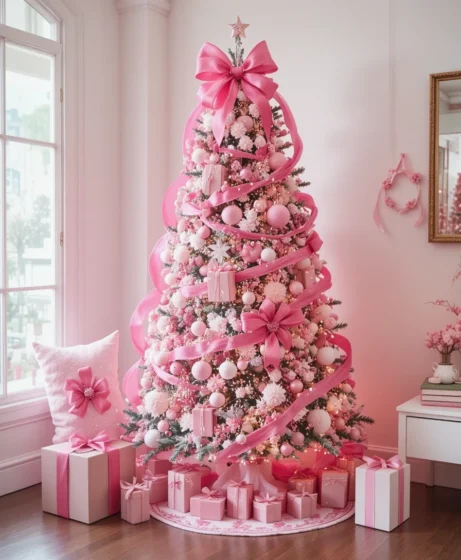 Hot pink ribbons add bold energy and instant color contrast. Wrap them around your tree or tie them into large bows for a dramatic effect. This creates a playful and modern holiday vibe Pink Christmas Decoration .