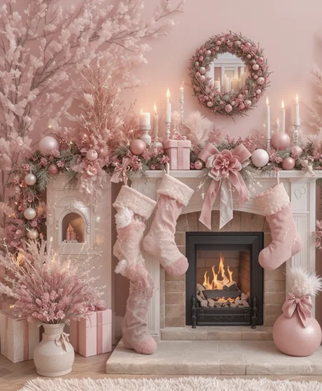 Switch classic red stockings for soft pink ones for a charming touch. Choose faux fur or velvet textures for a richer feel. They look adorable hung across a fireplace or staircase.