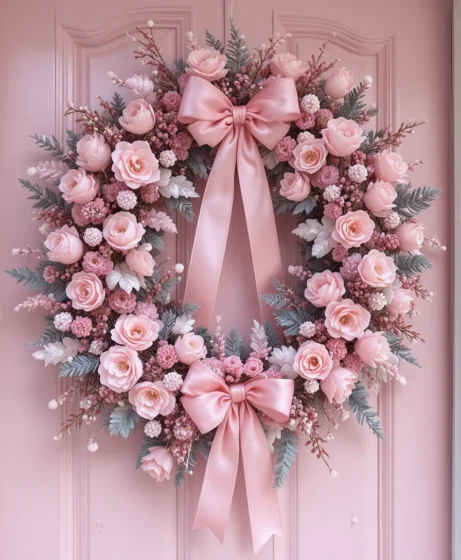 A pink wreath instantly sets the tone for your holiday theme. Choose faux flowers, soft berries, and satin ribbon for a feminine design. It makes your entrance feel warm and welcoming.
