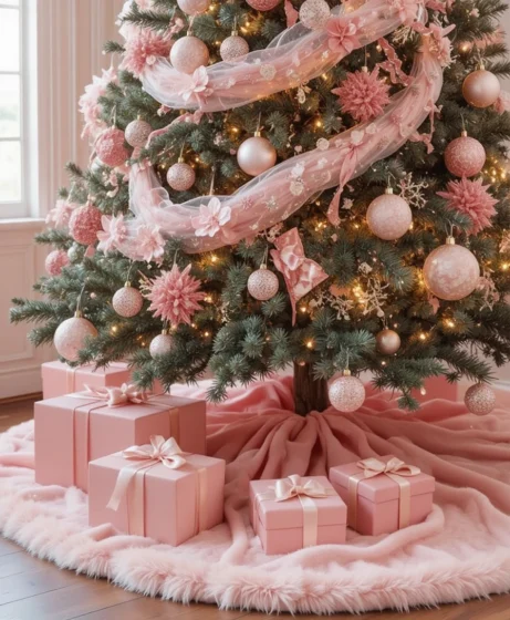 A satin or faux fur pink tree skirt adds depth and softness under your tree. It highlights presents and adds a gentle touch to your theme. Choose light blush or bright tones depending on your décor style Pink Christmas Decoration.