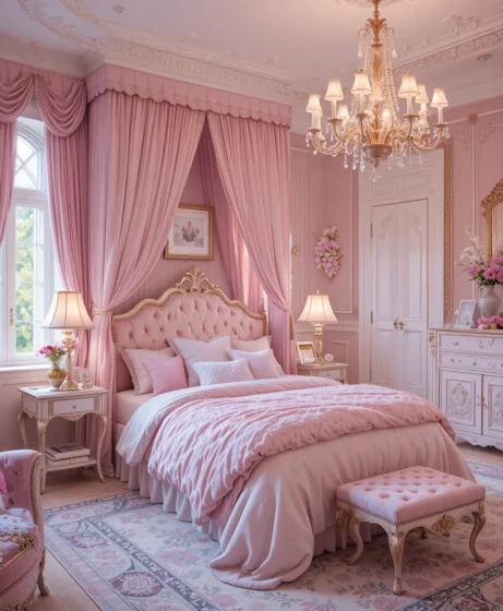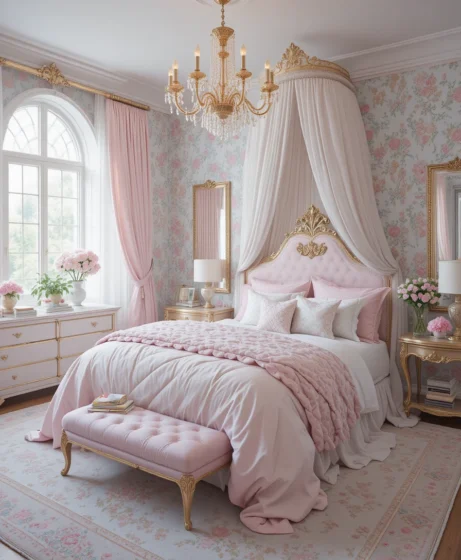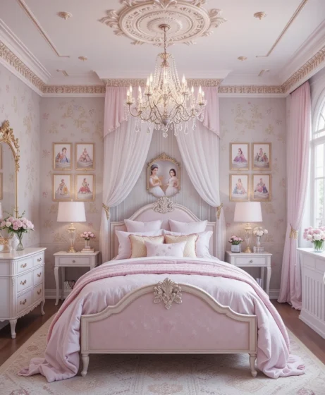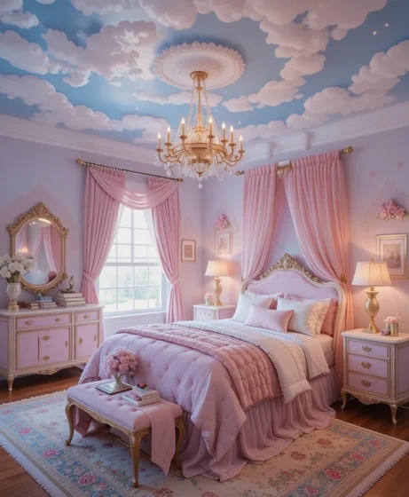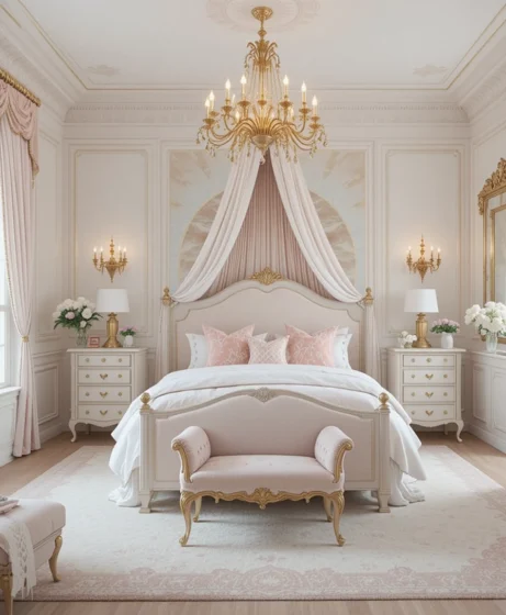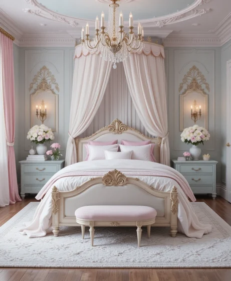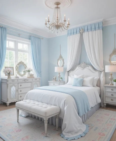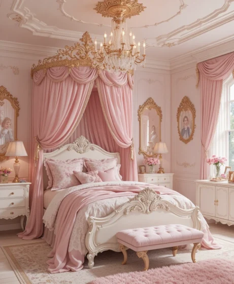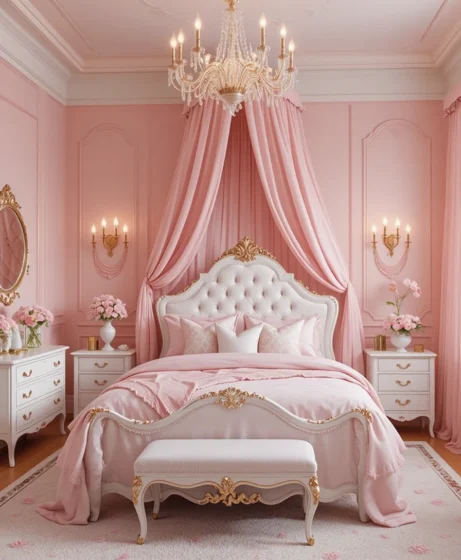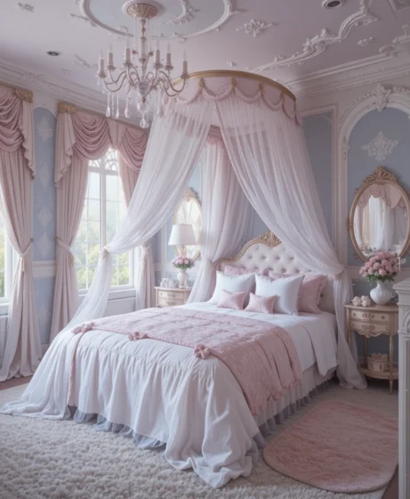 Add mirrored furniture, crystal knobs, and a statement rug. A perfect fusion of royal elegance and modern style Princess Bedroom.